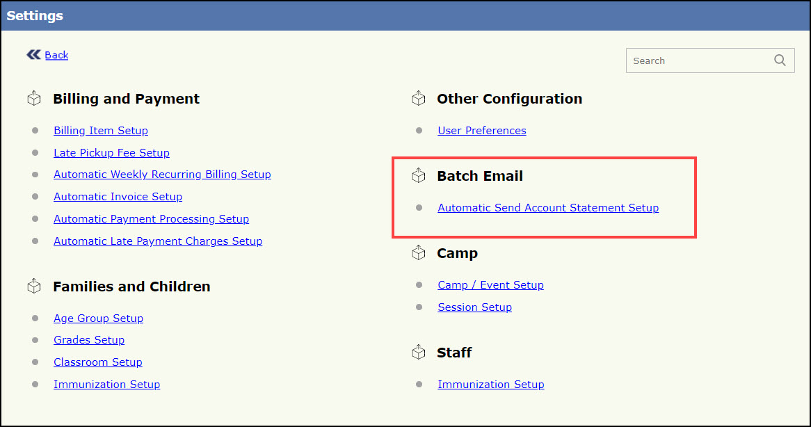 Automatic Send Account Statement Setup Page