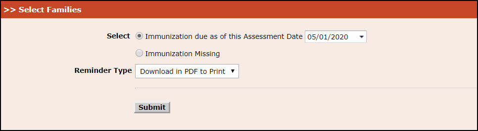 - Select Immunization due as of this Assessment Date and select the assessment date in Select Families Page 1 .