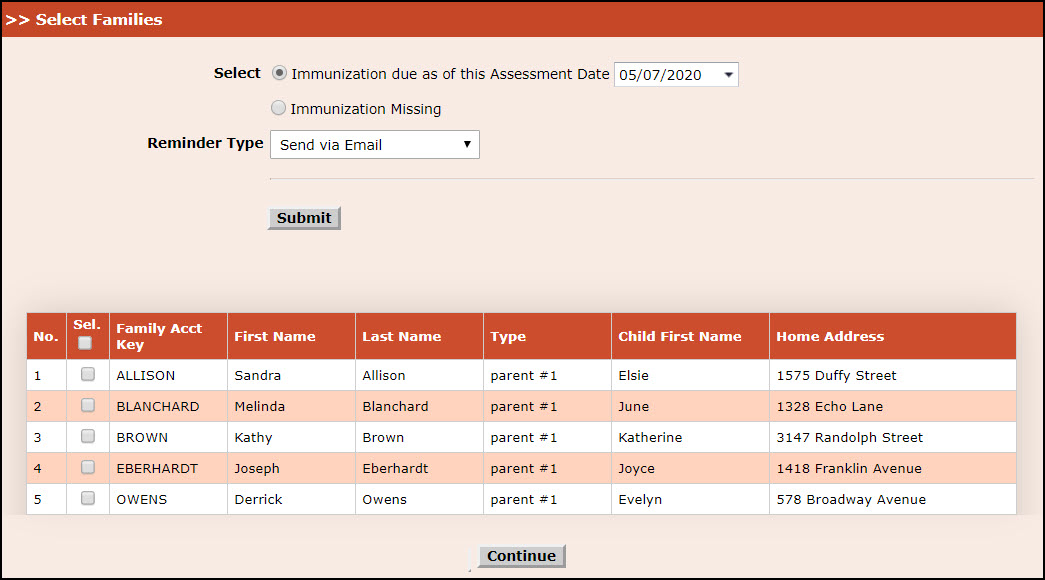 - Click Submit. Select Families Page 2 will be displayed: