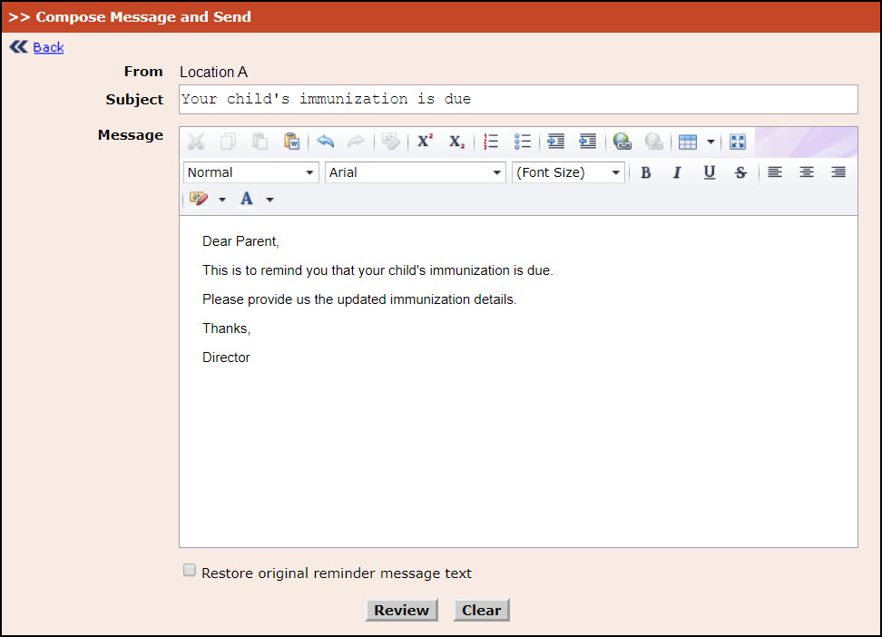 - Click Review. Review Message Page will be displayed to review the message.To clear the entered mail click Clear