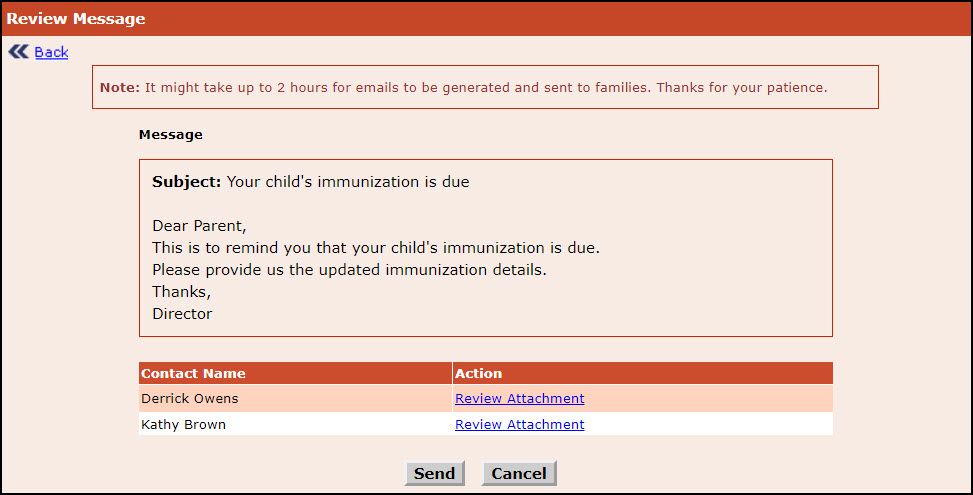 - Click Send, the email will be sent to the selected families.To go back to the review message page click Cancel.
