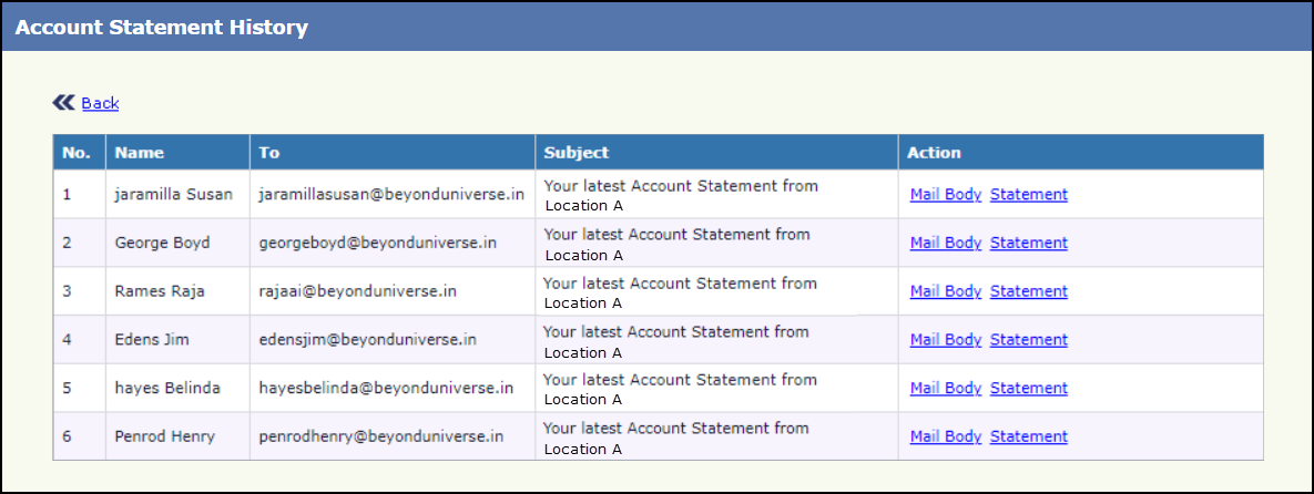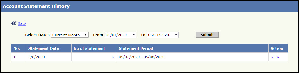 - Click View History in Automatic Send Account Statement Setup Page. Account Statement History Page will be displayed: