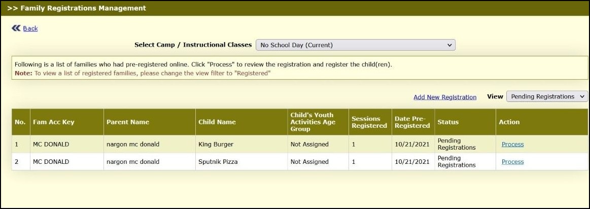 - Chose the relevant camp / instructional classes from the Select Camp / Instructional Classes list and 'Pending Registration' from the View list. The Family Registrations Management Page will be displayed with the list families in pending registration status.