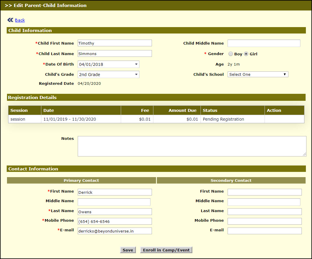 - Click Enroll in Camp / Instructional Classes , to register the child for camp and success message will be displayed for the camp registered.