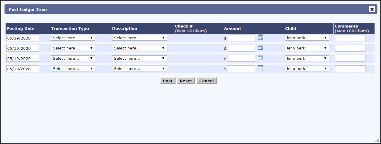 to make the necessary credit calculations (if any). - Select the specific child related to the transaction being posted from the Child list.
