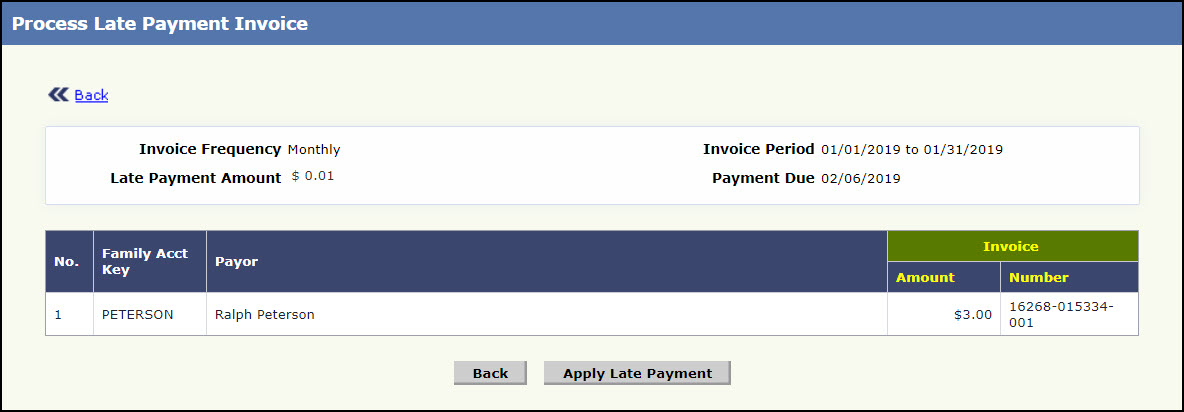 - Click Apply Late Payment to apply the late payment for the selected families. To go back to the Process Late Payment Invoice page 2, click Back.