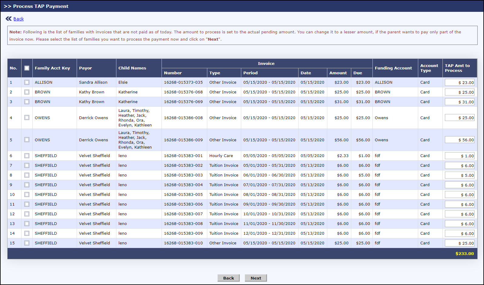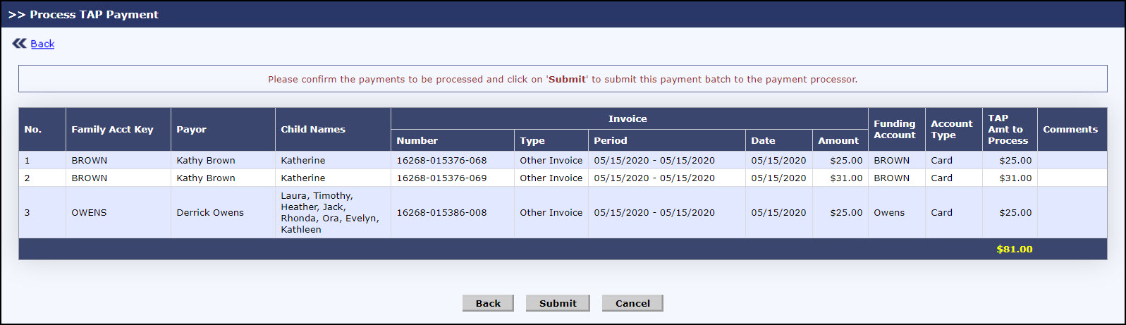 - Click Submit to process the payment for the selected family(s). A success message will be displayed. To go back to the Tuition Auto Pay page, click Back. To cancel the payment, click Cancel.