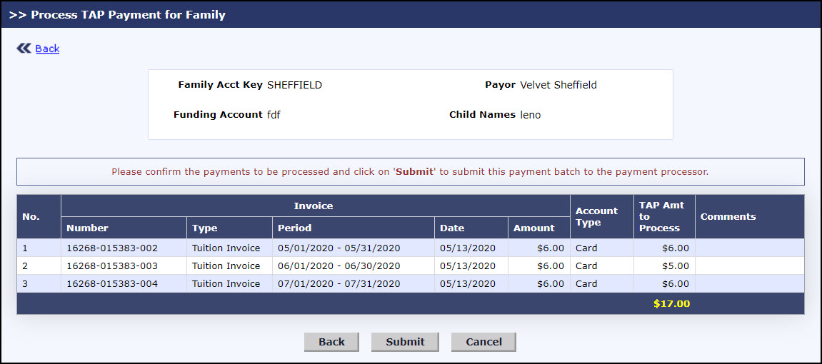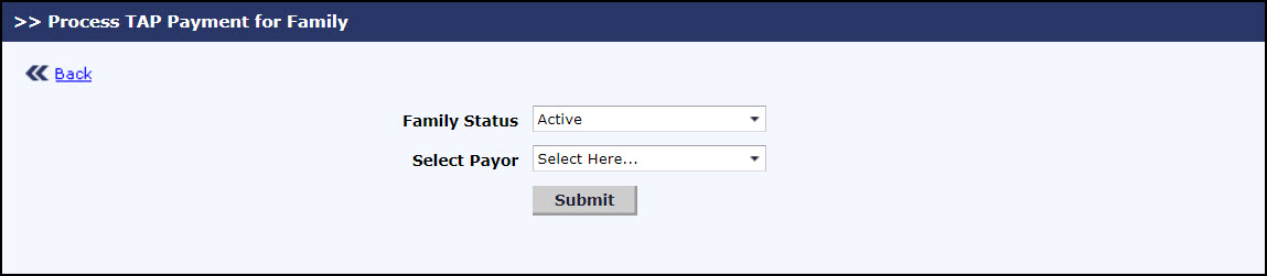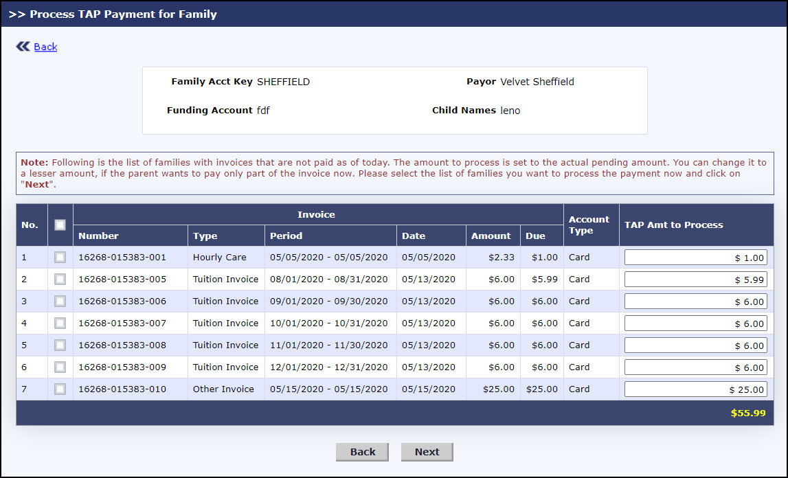 - Select the specific family for whom the TAP payment must be processed from Select Payor. The Process TAP Payment for Family page 2 will be displayed with the open invoices of that family.