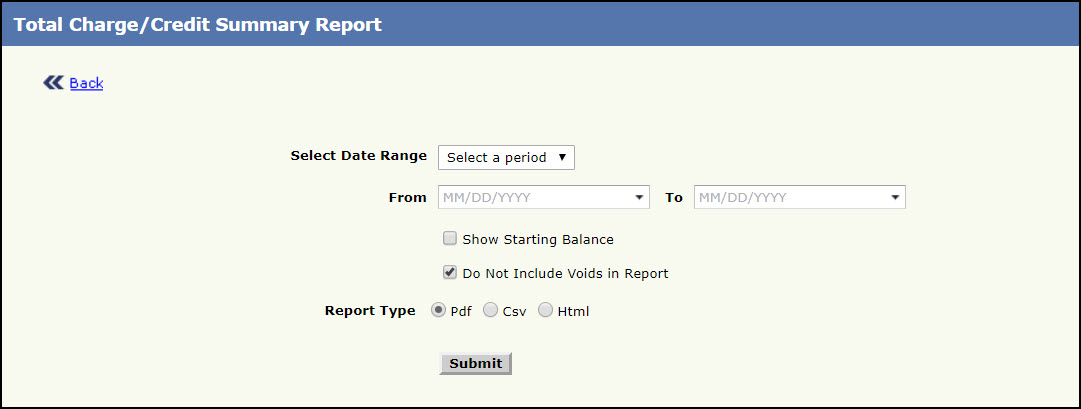 The Total charge / credit summary report is similar to the Specific charge / credit detail report, but here the user does not have option to filter based on the specific transaction.