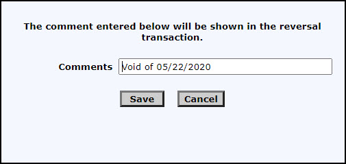 - Reversal transaction will have a default comment of “Void of MM/DD/YYYY” where the date is the date of the original transaction.