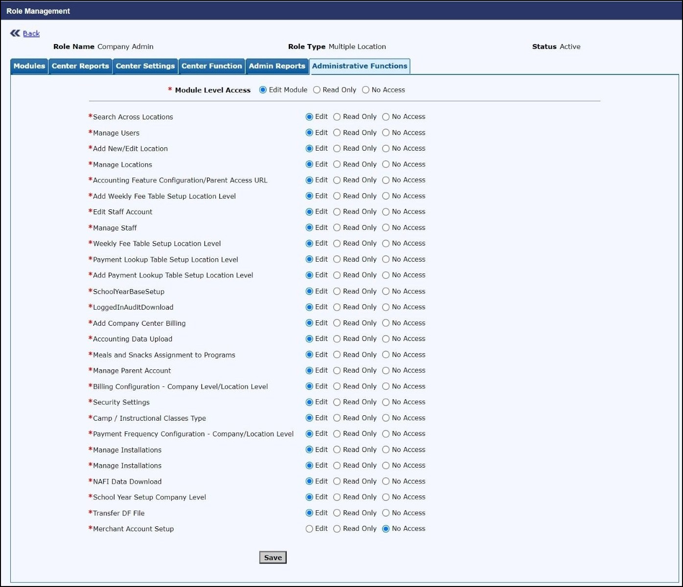 - Click View/Edit Administrative Functions against Company Admin role in the Role Management page, the Role Management page 3 will be displayed.