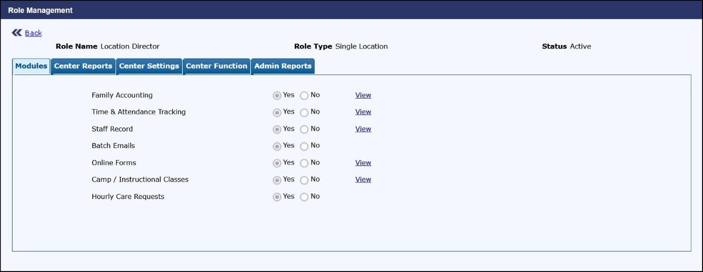 - Click Save to save the permissions for that specific module tab. To return to the Role Management page, click Back.