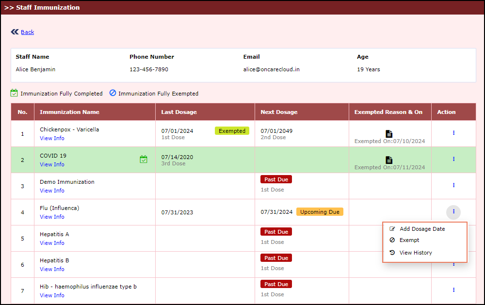 By clicking on the Action icon (Figure 12), the following actions related to Immunizations will be displayed (Figure 14):