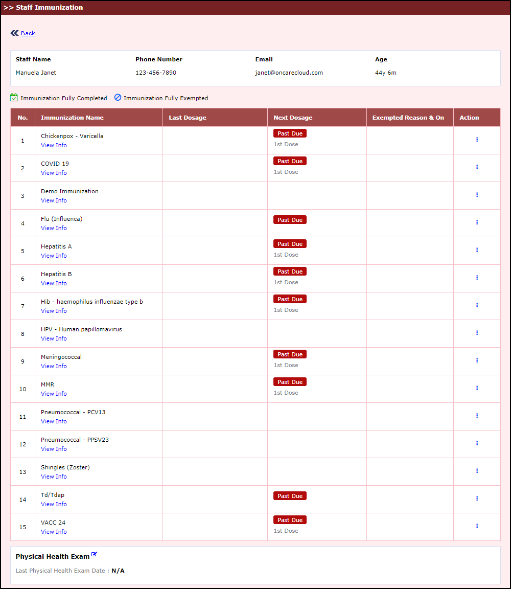 - For the first time, when the user views this page, all the immunizations applicable for the staff is based on age will be tagged as ‘Past Due’