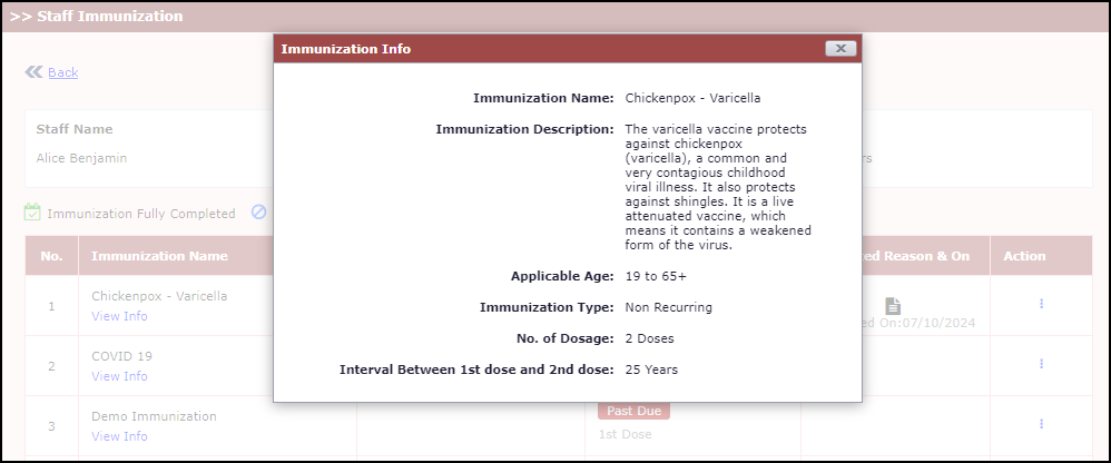 By clicking on View Info (Figure 12), all the immunizations details such as Immunization name, description, applicable age, immunization type, dosages and the frequency set at company level will be displayed. (Figure 13)