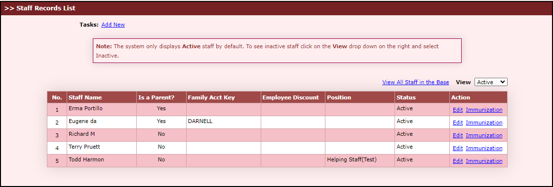 Clicking the Immunization link in a staff record (Figure 11) displays the Staff Immunization page. In the Staff Immunization page (Figure 12) all Immunizations irrespective of applicable age are listed.