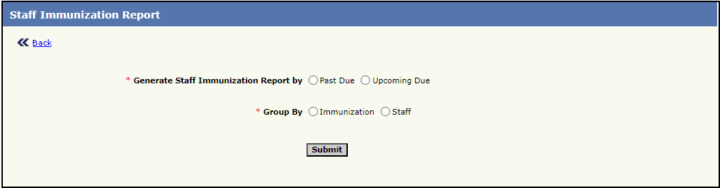 - Group by can be done either via ‘Immunization’ or by ‘Staff’.