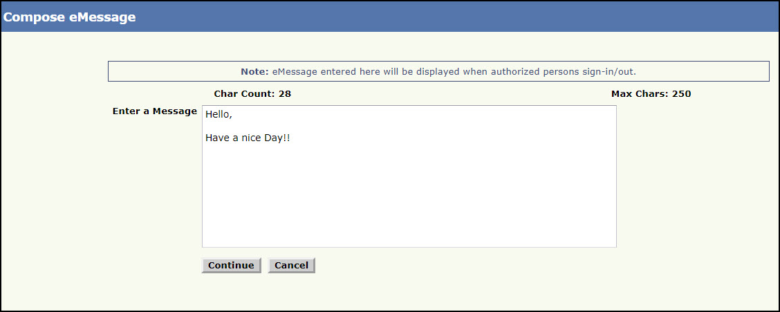 - Click Continue. The eMessage Review page will be displayed. To return to the eMessage Compose page, click Cancel.