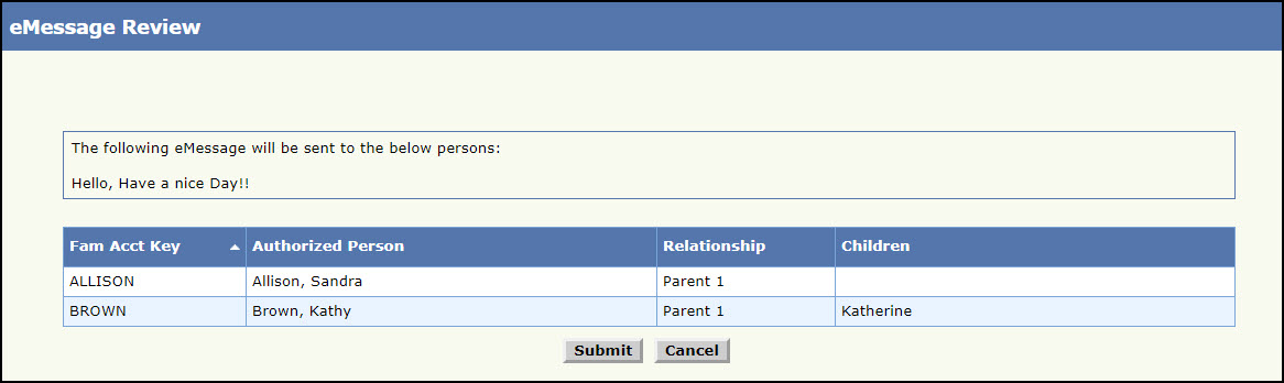 - Review the eMessage details and click Submit to save the eMessage. To cancel and return to the Compose eMessage page, click Cancel.