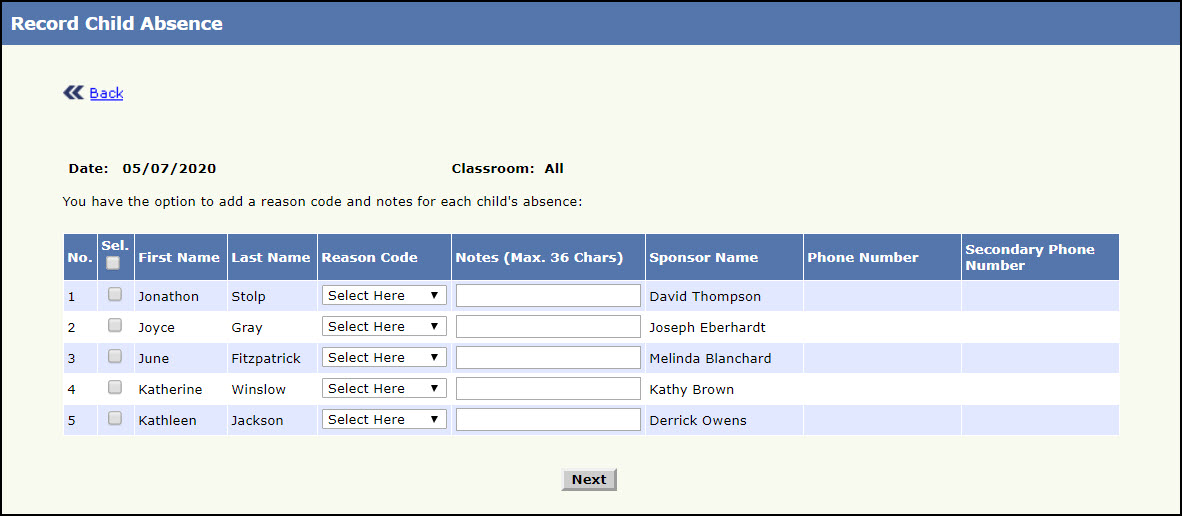 - Select the children else select Sel to select all the children, to mark absent. Select Reason Code from the list. Its Mandatory to select the Reason Code.