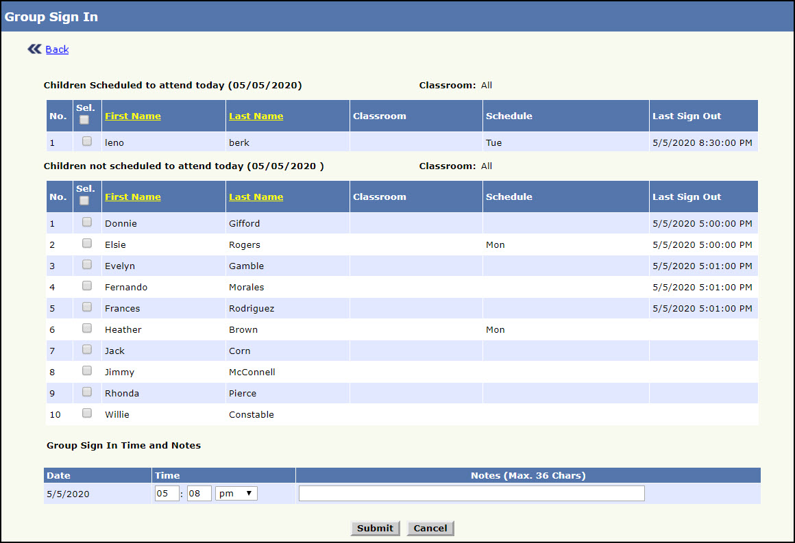 - From the Group Sign In with Absence Alert page 2, Select the particular children from the scheduled list.
