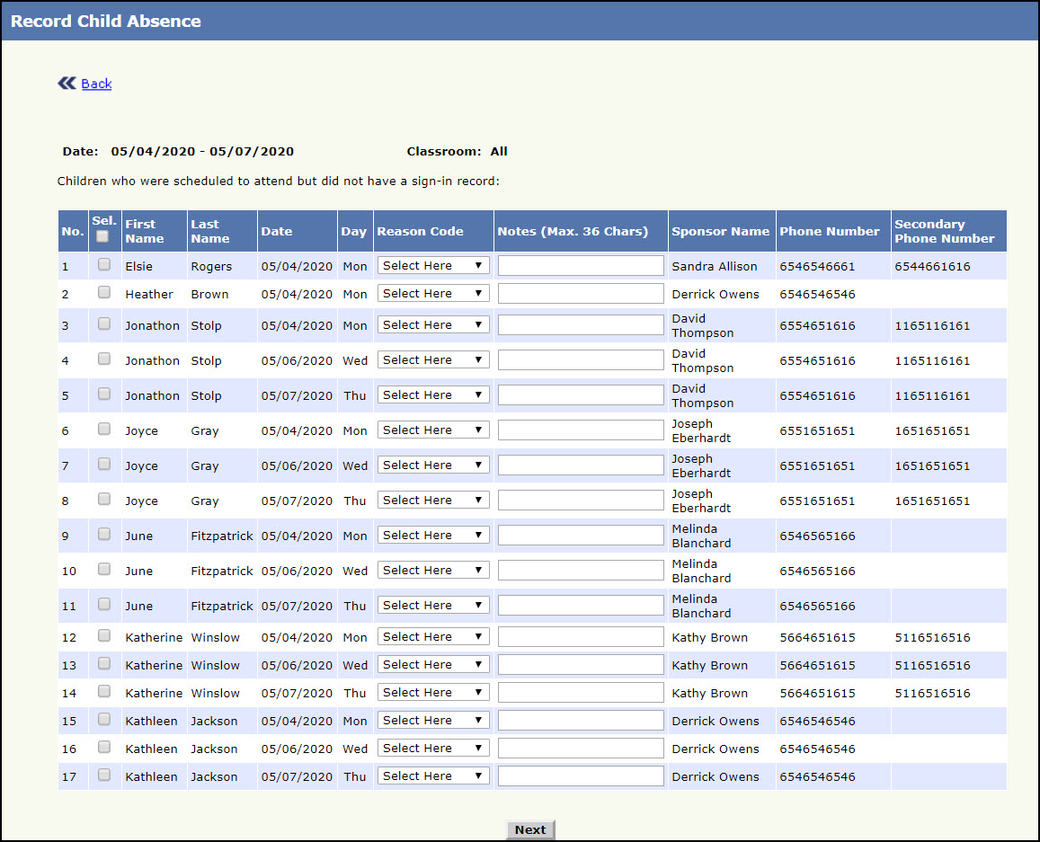 - Click Submit, Record Child Absence Page 2 will be displayed with the list of Children who were scheduled to attend but did not have a sign-in.