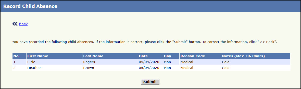 - If the child records are correct click Submit, else click Back.